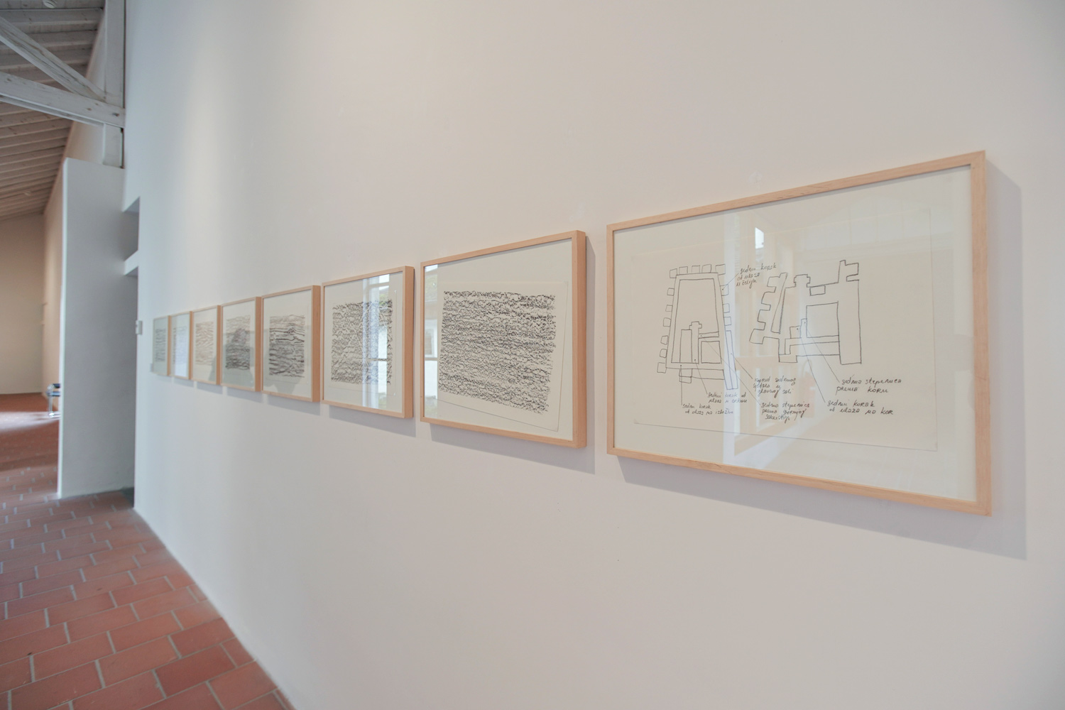 Maserungen von Holz und Stein inspirierten mich zu einer Serie von Frottagen. Ich legte das Papier direkt auf die unterschiedlichen Oberflächen und schaffte eine Art Abdruck des jeweiligen Ortes durch Schraffuren. Dabei war Joseph Kosuths Arbeit "Eine verstummte Bibliothek" im Unteren Keller des Museums eine Inspirationsquelle und die Zahl Sieben eine zweite: der siebte Schritt vom Eingang entfernt oder die siebte Stufe der Treppe in die Obere Sakristei. Eine zusätzliche Karte verzeichnet die sieben Entstehungsorte.